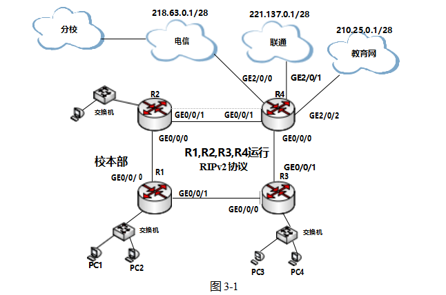 【说明】图 3-1 为某大学的校园网络拓扑,其中出口路由器 R4 连接了三个 ISP 网络,分别是电信 网络(网关地址 218.63.0.1/28)、联通网络(网关地址 221.137.0.1/28)以及教育网(网关地址 210.25.0.1/28)。 路由器 R1 、R2 、R3 、R4 在内网一侧运行 RIPv2 协议实现动态路由的生成。