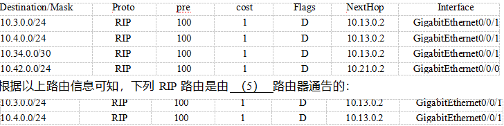 各路由器上均完成了 RIP 协议的配置,在路由器 R1 上执行 display ip routing-table , 由 RIP 生成的 路由信息如下所示: