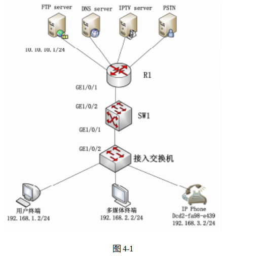 公司拥有多种业务, 例如 Internet、IPTV、VoIP 等,不同业务使用不同的IP 地址段。为了便于管理, 要根据业务类型对用户进行分类 , 以便路由器 R1 能通过不同的 VLAN 分流不同的业务。