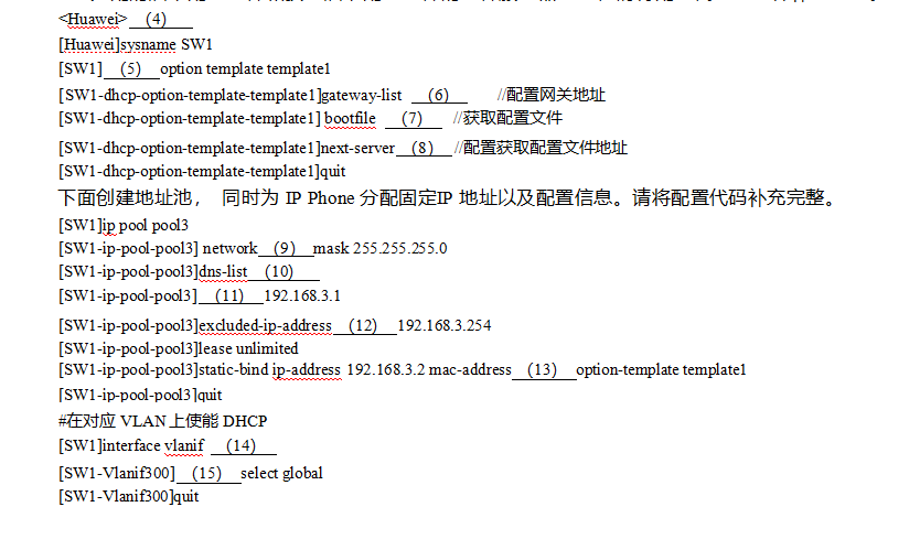 下面是在 SW1 上创建 DHCP Option 模板, 并在 DHCP Option 模板视图下, 配置需要为语音客户端 IP Phone 分配的启动配置文件和获取启动配置文件的文件服务器地址,请将配置代码或注释补充完整。