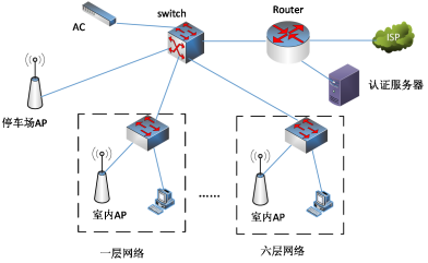 【说明】某单位由于业务要求,在六层的大楼内同时部署有线和无线网络,楼外停车场部署无线网络。网络拓扑如图1-1 所示。