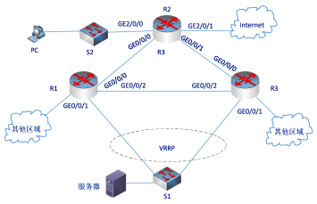 通过配置虚拟路由冗余协议(Virtual Router Redundancy Protocol,VRRP)使得服务器通过交换机S1为S1双归属到R1和R3,从而保证链路发生故障时服务器的业务不中断。R1为主路由,R3为备份路由,且虚拟浮动IP地址为10.2.2.10。