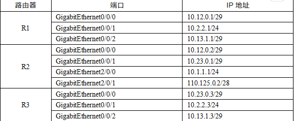 某公司网络拓扑片段如图3-1所示,其中出口路由器R2连接Internet,PC所在网段为10.1.1.0/24,服务器IP地址为10.2.2.22/24,R2连接的Internet出口网关地址为110.125.0.1/28。各路由器端口及所对应的IP地址信息如表3-1所示。假设各个路由器和主机均完成了各个接口IP地址的配置。