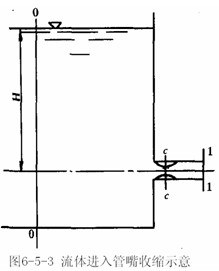 如图6-5-3的圆柱形外管嘴,流体进入管嘴直至收缩断面C-C的流动情况与孔口相同。由于收缩,使流体与管壁分离,形成旋涡区。然后液流再扩大充满整个管道断面后流出。设水箱水位不变,表面为大气压强,则有