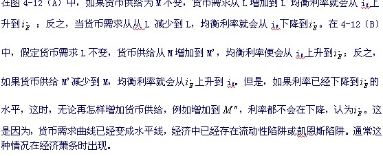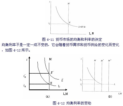 在货币市场均衡的条件下,利率即为均衡利率。货币市场均衡的条件是货币需求等于货币供给,即L=M。如图4―1l所示。