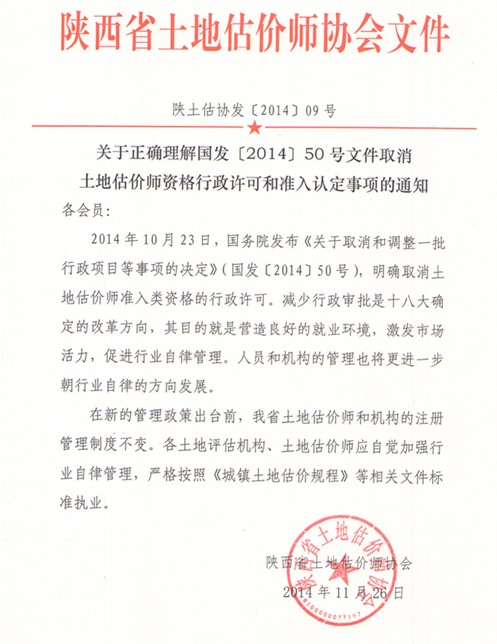 - 陕西转发取消土地估价师资格行政许可和准入认定2014-11-28
