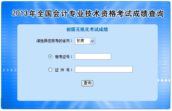 2013年甘肃初级会计职称无纸化考试成绩查询入口