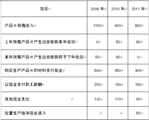 【例题2】甲公司管理层2008年年末批准的财务预算中与产品W生产线预计未来现金流量有关的资料如下表所示(有关现金流量均发生于年末,各年末不存在与产品W相关的存货,收入、支出均不含增值税):