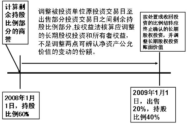因处置投资导致对被投资单位的影响能力由控制转为具有重大影响或者与其他投资方一起实施共同控制的情况下,首先应按处置或收回投资的比例结转应终止确认的长期股权投资成本。在此基础上,应当比较剩余的长期股权投资成本与按照剩余持股比例计算原投资时应享有被投资单位可辨认净资产公允价值的份额,属于投资作价中体现的商誉部分,不调整长期股权投资的账面价值;属于投资成本小于原投资时应享有被投资单位可辨认净资产公允价值份额的,在调整长期股权投资成本的同时,应调整留存收益。