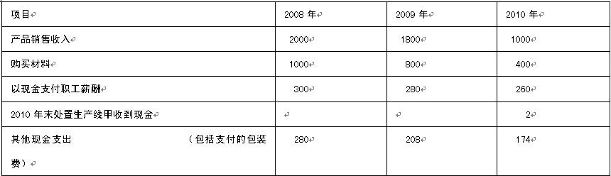 ②长江公司管理层2007年年末批准的财务预算中与产品甲生产线预计未来现金流量有关的资料如下表所示(2008年和2009年产品销售收入中有20%属于现销,80%属于赊销,其中赊销部分当年收款90%,余下的10%于下年收回,2010年产品销售收入全部收到款项;2008年和2009年购买材料中有30%直接用现金支付,70%属于赊购,其中赊购部分当年支付80%,余下的20%于下年支付,2010年购买的材料全部支付现金;有关现金流量均发生于年末,收入、支出均不含增值税,假定计算现金流量时不考虑2007年12月31日前的交易)。