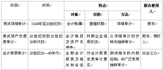 (三)注册会计师审计从形成到发展经历了详细审计阶段、资产负债表审计阶段、会计报表审计阶段。
