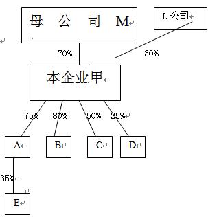 甲企业的母公司为M公司,所占股权比例为70%,另一投资者L公司所占股权比例为30%;甲企业直接投资A、B、C、D四家公司,股权比例分别为75%、80%、50%、25%;A公司投资E公司,所占股权比例为35%。