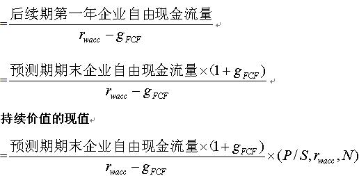 预测期期末价值称为持续价值,也就是后续期企业自由现金流量折现到预测期期末的价值。