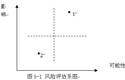 用以评估风险影响的常见的定性方法是制作风险评估系图。风险评估系图能识别某一风险是否会对企业产生重大的影响,并将此结论与风险发生的可能性联系起来。这种方法能够为确定业务风险的优先次序提供框架。如图9-1所示,与影响较小且发生的可能性较低的风险(在图中的点2)相比,具有重大的影响且发生的可能性较高的风险(在图中的点1)更加亟待关注。每种风险的重大影响程度及影响会因企业结构的不同而有所差别。