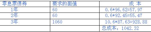 如果该息票债券的价格高于这一价格,投资者可以通过出售该息票债券,同时买入上述零息票债券组合进行套利。如果该息票债券的价格低于1042元,则可以通过买入该息票债券并卖空上述零息票债券组合套利。