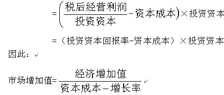 这里的企业的市场增加值与经济增加值(即经济利润)有联系。经济增加值是分年计量的,而市场增加值是预期各年经济增加值的现值。