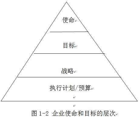 企业使命有助于确定发展目标,发展目标为实现使命服务。目标是相对于使命更为具体化的产物。目标还可以进一步分解为一系列业务目标,通常包括立即执行的利润和销售目标;子目标还可以进一步细分为各个业务单位或部门各种短期目标,如每个季度订单数量等。图1-2描述了企业使命和目标的层次关系。