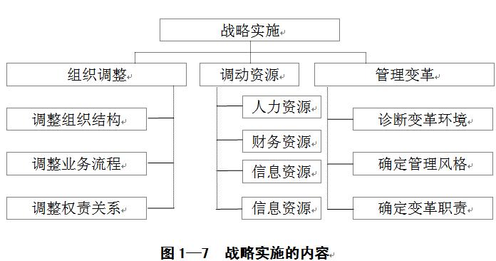 战略实施是指如何将战略转化为实践,其主要内容是组织调整、调动资源和管理变革(见图1—7)。