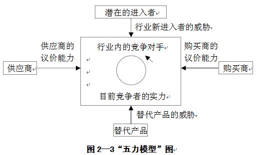 迈克尔·波特提出的五种力量模型是最具代表性并被广泛应用的战略分析模型:“五力模型”,用以确定企业在行业中的竞争优势和行业可能达到的最终资本回报率,如图2-3所示。