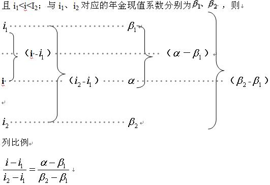 例如:若所求的折现率为i,对应的年金现值系数为α;i1、i2分别为与i相邻的两个折现率,