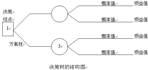 圆形结点称为状态结点,状态结点引出若干条直线,表示不同备选方案可能出现的不同的自然状态,称为状态枝。在状态枝上面标明对应自然状态的名称及其出现概率;在状态枝末端标明该方案在该对应自然状态下的损益值或效用值。该方案的综合期望值列在圆形结点的上方。