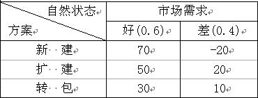 例题:某企业为增加某产品的产量而设计了三个可行方案:一是投资100万元新建生产车间;二是投资50万元,扩建老车间;三是转包给其他厂生产,设使用期为5年,自然状态如表: