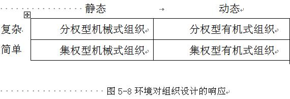 组织在这些“隔间”中的相对位置取决于其所处的外部环境。处于稳定环境中的成功的企业大多具有机械式设计的特点。比如,金融机构多具有较为机械式的结构,以确保遵守规则和规定,从而以严谨的方式来管理其投资或客户存款。当复杂性增加时,可通过将决策职责向下分配给老师来解决复杂性问题。这就是说,处于复杂环境的企业采用的结构更为分权化。另一方面,处于变动环境中的成功的企业多具有较为有机式设计的特点。换言之,由于企业环境可能会迅速变化,企业需要有机式管理系统的快速性和灵活性,因此企业的组织设计对环境的适应性越强,企业的运行就越有效。例如,广告代理商多采用有机式企业设计,以促进企业的创造性和创新能力,而创造性和创新能力正是广告企业取得成功的关键要素。