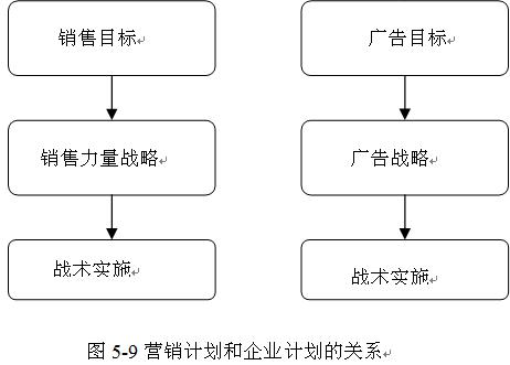 营销计划是实施企业战略的一种方式,需要制定具体的实施计划并且需要控制。企业战略计划旨在引导企业的整体发展;营销计划从属于企业计划,但也探讨了许多相同的问题并给出了一些解决方案。营销计划的战略组成部分关注企业在特定市场或市场组的发展方向,以便实现一组指定目标。营销计划还需要一个运营组成部分未定义要执行的任务和活动,以便实现理想战略。营销计划与产品和市场尤为相关。图5-9概述了营销计划与企业计划的关系: