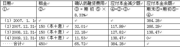 接例1,租赁开始日租赁资产公允价值为400万元,最低租赁付款额的现值为384.28万元,根据孰低原则,租入资产的入账价值为384.28万元;在2007年1月1日账务处理如下: