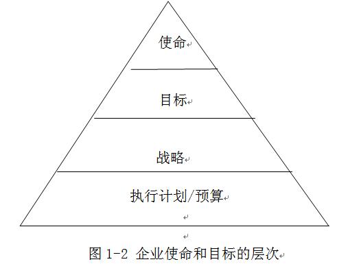 企业使命有助于确定发展目标,发展目标为实现使命服务。目标是相对于使命更为具体化的产物。目标还可以进一步分解为一系列业务目标,通常包括立即执行的利润和销售目标;子目标还可以进一步细分为各个业务单位或部门各种短期目标,如每个季度订单数量等。图1-2描述了企业使命和目标的层次关系。