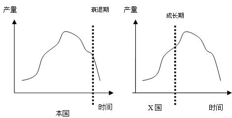 如图2-5所示,企业产品在本国的生命周期进入了衰退期,企业可以把产品推向X国和Y国,创造商机。
