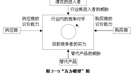 迈克尔?波特提出的五种力量模型是最具代表性并被广泛应用的战略分析模型:“五力模型”,用以确定企业在行业中的竞争优势和行业可能达到的最终资本回报率,如图2-3所示。