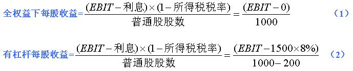 教材例题:某全权益公司,预期明年产生的息税前利润EBIT为1000万元,不考虑公司所得税。公司当前有1000万股流通股,每股交易价格为7.5元。公司正打算以8%的利率借款1500万元,并用所借资金以每股7.5元的价格回购200万股股票,从而调整资本结构。
