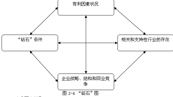 波特教授提出了国家或地区的公司在全球范围内取得优势所需要的四个要素,并以“钻石”图来显示。如图2-4所示:
