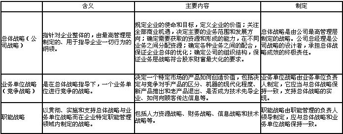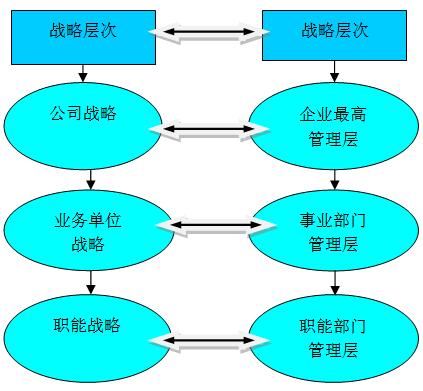 企业战略可以划分为三个层次:公司战略、业务单位(竞争)战略和职能战略。