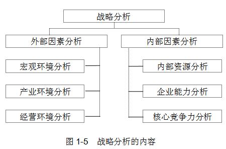 外部因素分析包括宏观环境分析、产业环境分析和经济环境分析。环境的现状影响企业的价值创造,环境的变化会给企业带来机会与威胁。内部因素分析也称资源与能力分析,包括内部资源分析、企业能力分析和核心竞争力分析。内部因素分析的目的是识别自己的优势和劣势,掌握战略选择的限制性因素。