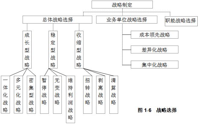 战略制定是指根据企业所处外部环境及自身条件的分析,选择适宜公司发展的战略。战略分析可以帮助企业评估环境并确定企业机会与威胁。战略设计需要捕捉发现的机会并尽可能防范可能的威胁。战略设计还需要考虑自己的优势与劣势,尽量利用自己的优势,克服或最小化自己的弱项。强项可能是公司的技术或专有资源,弱项可能是使企业处于不利竞争地位的条件或领域。战略设计通常包括总体战略选择和业务单位战略选择。(见图1―6)。