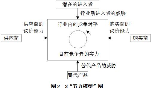 迈克尔?波特提出了最具影响力战略分析模型――五力模型,用以确定企业在行业中的竞争优势和行业可能达到的最终资本回报率,如图2-3所示。按照迈克尔?波特的理论,产业中存在五种基本的竞争力量:(1)潜在的进入者;(2)供应商的议价能力;(3)购买者的议价能力;(4)替代品;(5)现有竞争者之间的竞争强度。这五种竞争驱动力决定了企业的最终盈利能力。