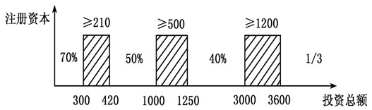 (4)投资总额在3000万美元以上的,注册资本至少应占投资总额的1/3,其中投资总额在3600万美元以下的,注册资本不得低于1200万美元。