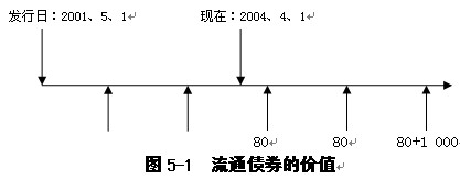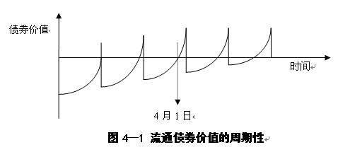 流通债券的价值在两个付息日之间呈周期性变动。对于折价发行债券来说,发行后价值逐渐升高,在付息日由于割息而价值下降,然后又逐渐上升。总的趋势是波动上升,如图4―1所示。越临近付息日,利息的现值越大,债券的价值有可能超过面值。付息日后债券的价值下降,会低于其面值。