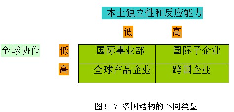 (2)国际子企业。国际子企业以地理位置为基础并在各国家内独立经营。在这些企业中,基本上所有的管理职能都以国家为基础,从而实现高度的本土反应能力。母企业的控制权可能依赖于计划体系和报告体系,并且母企业可能对国际战略拥有最终否决权,但全球协作水平可能比较低。