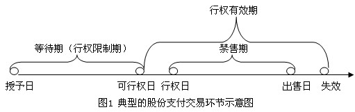 以薪酬性股票期权为例,典型的股份支付通常涉及四个主要环节:授予、可行权、行权和出售,见图1。