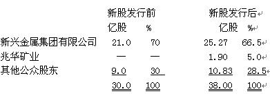 新兴钢铁按照相关证券法规,以每股人民币2.5元的价格向兆华矿业定向发行1.9亿股普通股,并以相同价格向现有股东配售6.1亿股普通股。新股发行前后的股份变动如下: