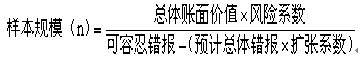 样本规模=总体账面金额(不包括100%检查)÷可容忍错报×保证系数