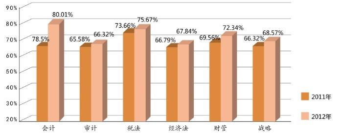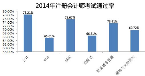 通过对网校学员的电话回访,统计出网校2014年注册会计师考试辅导通过率情况为: 《会计》78.21%,《审计》65.61%,《税法》75.67%,《经济法》66.81%,《财务成本管理》73.41%,《战略与风险管理》69.72%。
