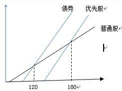 【解析】当存在三种筹资方式时,最好是画图来分析。画图时要注意普通股筹资方式的斜率要比另外两种筹资方式的斜率小,而发行债券和发行优先股的直线是平行的。本题图示如下: