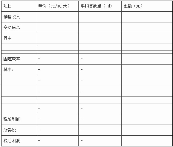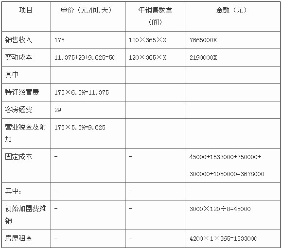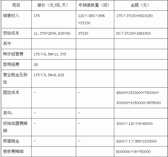 (5)经济型酒店的人工成本为固定成本。根据拟开设酒店的规模测算,预计每年人工成本支出105万元。