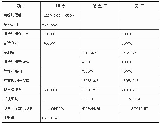 原始投资额=加盟保证金+初始加盟费+装修费+营运资本=100000+3000×120+6000000+500000=6960000(元)