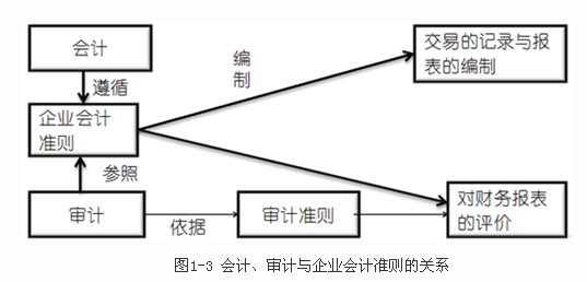 3.审计依据是“既定标准”。如果从2013年《审计》教材看,根据第五章第一节的财务报表审计总体目标与审计工作前提,或者根据《中国注册会计师审计准则第1101号――注册会计师的总体目标和审计工作的基本要求》第六条,这里的“既定标准”即为“适用的财务报告编制基础”。与此同时,实践工作中的会计工作与审计工作的关联也是这个“既定标准”。企业会计工作是会计人员遵循“既定标准”对“交易的记录与报表的编制”(如下图1-3),审计工作是审计人员遵循审计准则的要求参照“既定标准”(如上图1-2)对“经济活动与经济事项认定”进行再认定的过程。