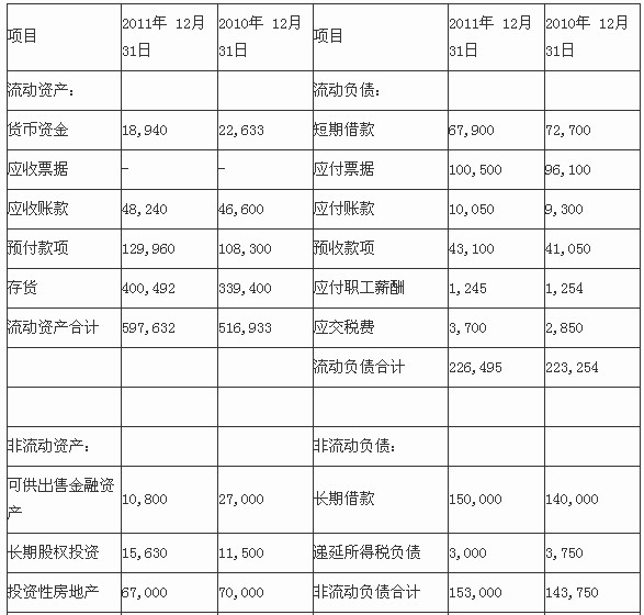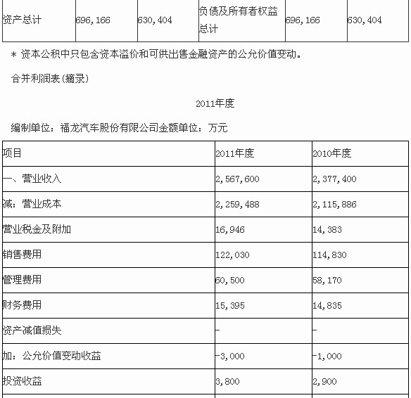 福龙汽车2011年度合并资产负债表和合并利润表摘录如下(其中:2010年度财务数据已经旺华会计师事务所审计,2011年度财务数据尚未经审计):